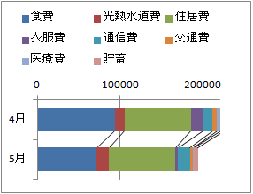 右のグラフは,ある人の今年4月,5月の家計支出額を示したものです.このグラフの種類を答えてください.