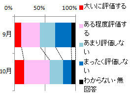 (B) 各項目の並べ方に意味があるとき・・・例えば,このアンケートのように「肯定的な回答から否定的な回答へ」並んでいるときは,その順序に従って結果を表示した方が分かりやすいでしょう. (C) あらかじめ予想する順序がないもの・・・例えば,すきなスポーツの種類を答える場合など・・・のときは,回答の多い順に表示する方がよいでしょう.ただし,「その他」「保留」「無回答」のように,他の内容が決まらなければそれ自体の内容が決まらないもの(他の項目の残りのようなもの)は,どんなに多い割合になっても最後に回すのがよいでしょう.(上の例では黒色の部分) |