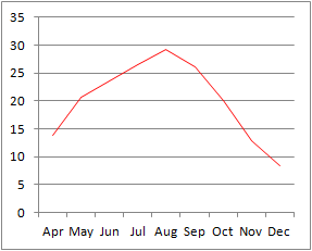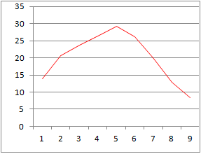 折れ線グラフを描くときに,温度のデータだけの1つの列を選択した場合,右のようなグラフになります.このとき横軸に付けられるラベルは月名ではなく,そのデータの番号になりますので,1は1月を表していません.このように折れ線グラフを作るときに,横軸のラベルを想定通りに付けるには,グラフのデータとして,横軸のラベルを含む列データを含めて指定するとよい. |