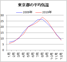 数量の時間的変化を示すのに適しています.(空間的な変化については,次の散布図を参照してください) 【例3.1】 次の表は,2019年4月〜12月の京都市月毎の平均気温(°C)で,これを折れ線グラフに表したものが,右のグラフです.