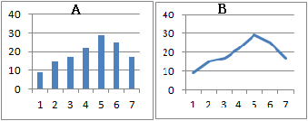表7のように1列目が文字データである場合,右図のように1列目を横軸のラベルに取り入れて棒グラフとして描くことはできます.ただし,単なる棒グラフとヒストグラムとでは,決定的に違うことがあります.