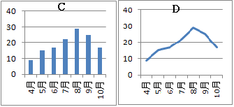 棒グラフや折れ線グラフでは,主軸は必ず1目盛ずつ増えるように固定されており,これに対応して変化する1つの量的変数の値をy座標としてグラフにします. 【例4.1】 次の表1のB列だけを選択して,棒グラフ,折れ線グラフにすると,グラフA,グラフBになります.表1のA列とB列の2列を選択して,棒グラフ,折れ線グラフにすると,グラフC,グラフDになります. 横軸に月が入るだけで,「横は1目盛ずつ進む」「B列の値を縦(y座標)として使う」というルールでグラフが描かれます.