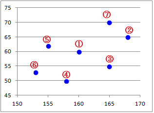 これに対して,散布図は原則として2列の値を(x座標,y座標)の意味に解釈して点を打ちます. 表2の桃色の範囲を選択して,挿入→散布図を選ぶと,右図のようなグラフになります.