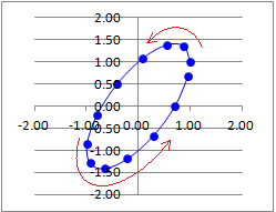 4.1 平滑線マーカー付き散布図 散布図では,「点(マーカー)だけ」「点(マーカー)を結ぶ曲線を付ける場合」「点(マーカー)を結ぶ折れ線を付ける場合」「点(マーカー)なしで線だけの場合」などが選べます. 次の表3の全体を選択して,挿入→散布図(平滑線とマーカー)を選ぶと,右図のようなグラフが描けます.マーカーなしで曲線だけのグラフも描けます.(赤で示した矢印は,回る順序が分かるように書き込んだもので,Excelグラフにはない)