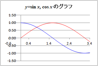 赤で示したグラフが y=sinx,青で示したグラフが y=cosxです. ![]() |