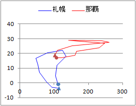 降水量には共通の値はありませんが,x座標に降水量を並べます.気温の値は,札幌と那覇で別の列に書きます. これを折れ線散布図(マーカーなし)にすると,次のようなグラフができます. ![]() |