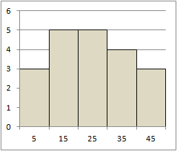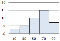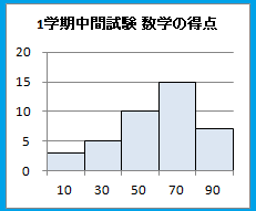 右のヒストグラムから,平均値,中央値,最頻値を求めてください.なお,中央値,最頻値については,それが含まれる階級幅を按分して答えてください.(中央値,最頻値についてはこのページ参照) |