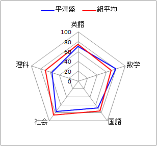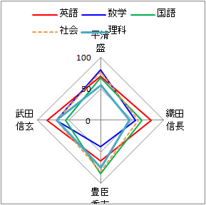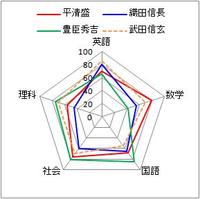正多角形(蜘蛛の巣の形)に配置して,中心から離れるほど大きい値を表す.項目同士のバランスを比較するのに適している. 【例7.1】