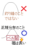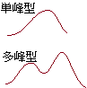 ベル型というのは,西洋の教会の鐘の形ということで,日本でよく見る釣り鐘の形ではない.どちらかといえば,「麦わら帽子の形」「マイフェアレディの帽子」「裾の長い富士山の形」のことをベル型と言い慣わしている.もっとはっきり言えば「正規分布曲線=ベル型」と考えればよい. 単峰型,多峰型 1つの山から成る分布は,単峰型と呼ばれる.これに対して,大人と子供を混ぜて身長の分布を調べたときのように,複数個の峰ができる分布は,多峰型(2つの峰からなるときは双峰型)と呼ばれる.