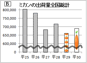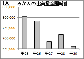 ※統計で嘘をつかない右のグラフAは,政府統計/みかんの出荷量全国総計/5年間の変化をグラフにしたものです. このグラフに「いろりやこたつを囲む生活習慣の減少」「マニキュアやネイルアートをしている女性がみかんの皮むきを嫌う」といった分析の一文が添えられていると,みかん生産農家から見れば絶望的な状況を表しているかのように見えます. このグラフは政府統計を用いたもので,数値には誤魔化しはありませんし,分析の一文も全くの嘘を述べているわけではなさそうです. しかし,グラフAでは,みかんの出荷量が激減しているように見えますが,実際には5年間で約17%減少しただけです.大げさな議論になってしまうのは,グラフAは