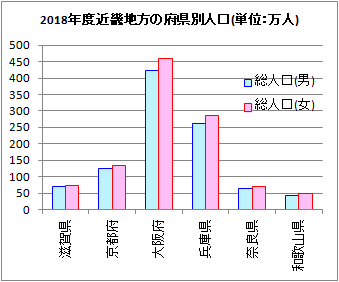 この表を基にして,下の見本のような複数系列棒グラフを作ってください.なお,この表には府県番号は書かれていませんが,府県番号はJISコードで決められており(滋賀県25〜和歌山県30),棒グラフに示す府県の順序はこのまま変更しない方がよい. ![]()