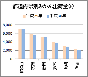 1.2 複数系列の棒グラフ【例1.2】 右のグラフは,平成29年と平成30年の都道府県別みかん出荷量(単位t)--農林水産省公表資料--を縦棒グラフにしたものです. このグラフでは上位6県までを表示したものです. このグラフのように,同一ラベル(都道府県)に対応する2つの年の数量を棒グラフにしたものは,複数系列の棒グラフと呼ばれます.
