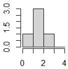 right=Fを指定すると,0≦x<1, 1≦x<2, 2≦x<3, 3≦x<4の区間に各0,1,3,1個あるというグラフになる. 日本では,この分け方が普通だから,right=Fと決める方がよい. |