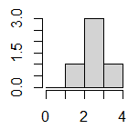 【例3】 x<-c(1,2,2,2,3) hist(x, breaks=c(0,1,2,3,4))