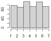 疑似乱数として1から6までの目を600回発生させて(サイコロを600回投げる実験の代わり),出た目の数をヒストグラムに描く x<-floor(runif(600, min=1, max=7)) hist(x, right=F, breaks=seq(1,7,by=1))