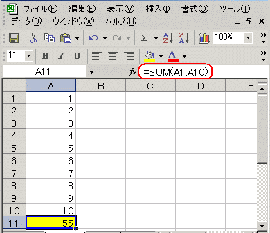 ■ Σ記号に慣れよう(Σ記号の値をExcelで求めるには) ■解説(1) k を数値で求めるには: 右図のようにセルA1に1,A2に2,・・・,A10に10を書き込んでおき(*1),セルA11に関数 (初歩的な参考) (*1) セルA1〜A10に,1〜10を書き込むには