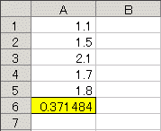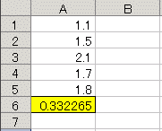 次のように,変数x1,x2,x3,・・・,x5 の値がセルA1〜A5に入力されているとき,![]() これら5つの変数の不偏分散は,=VAR(A1:A5) で求められる. Excelのメニューから関数を選択するときは,メニュー→「挿入」→「関数」→「統計」→VAR ※ Excel関数として,よく似たものが他にもあるので注意 |