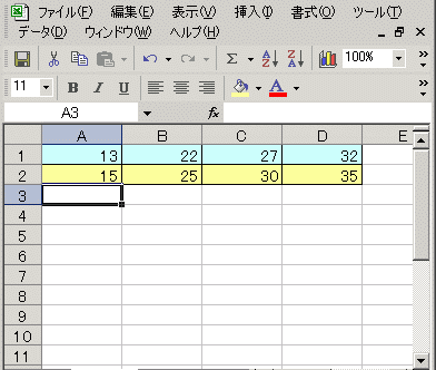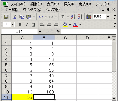 1例 (他の方法でもよい) (1) A1〜A10に1〜10を書き込む. (2) B1に =A1*2+1 と書き込む. (3) B1をポイントし,セルの右下でマウス形状が十字になったら,B10までドラッグする. (4) B11に =SUM(B1:B10)と書き込む.B11の値が答. |