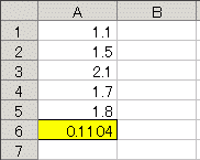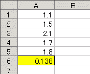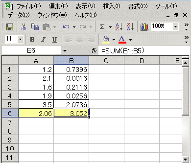 次のように,変数x1,x2,x3,・・・,x5 の値がセルA1〜A5に入力されているとき,![]() これら5つの変数の変動は, (1) A6 に平均値を求める:=AVERAGE(A1:A5) (2) B1に=(A1-$A$6)^2と書き込むみ,B5までコピー貼り付け (3) B6に=SUM(B1:B5) ・・・これが変動 |